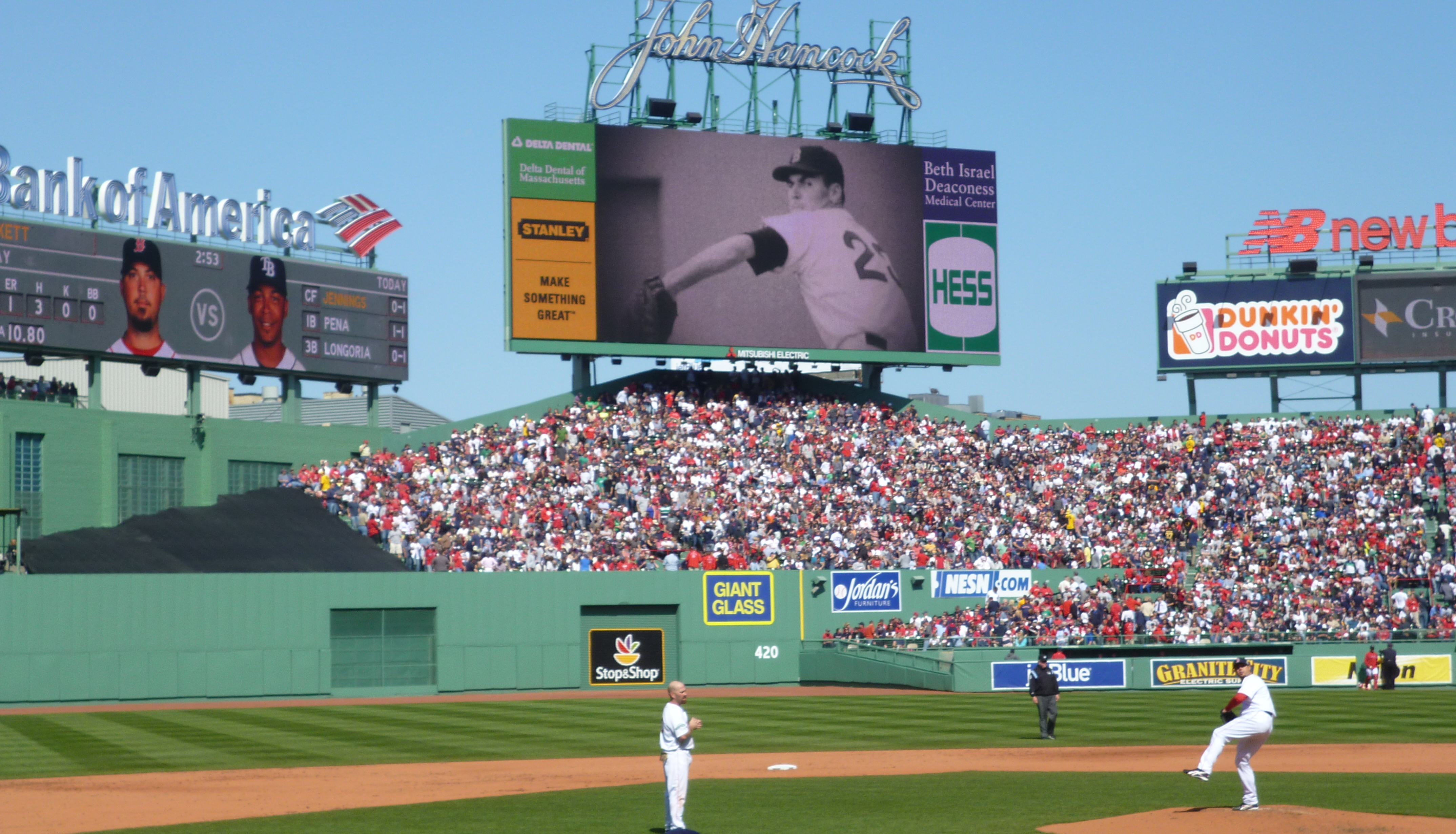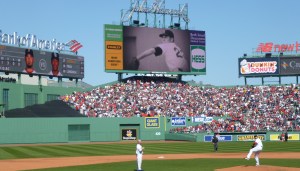 Fenway now has three Jumbotrons; each displays player statistics with a faux Fenway scoreboard background. On the John Hancock scoreboard, we’re looking at a video of the immortal Dave Morehead.